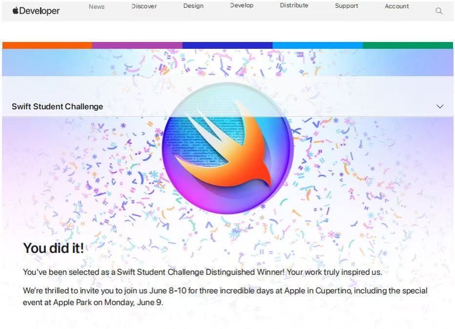 蘋果公司自2020 年開始舉辦Swift Student Challenge賽事,旨在支持和激勵新一代開發(fā)者、創(chuàng)作者和企業(yè)家。要求在 App Playground 中創(chuàng)建一個互動式場景,并提供不超過三分鐘的體驗。挑戰(zhàn)賽為學(xué)生開發(fā)者提供通過 App Playground 展現(xiàn)自身的創(chuàng)造力和編程能力的機會,并從中學(xué)習到可以在職業(yè)生涯和更多地方運用的實際技能。主辦方將選出 350 名 Swift Student Challenge 獲獎?wù)撸员碚迷趧?chuàng)新思維、卓越創(chuàng)意、社會影響或多元包容等方面表現(xiàn)出色的優(yōu)秀作品。并最終從獲獎?wù)咧羞M一步選出 50 名杰出獲獎?wù)撸⊿wift Student Challenge Distinguished Winner),并受邀參觀位于美國庫比提諾的 Apple 園區(qū)。