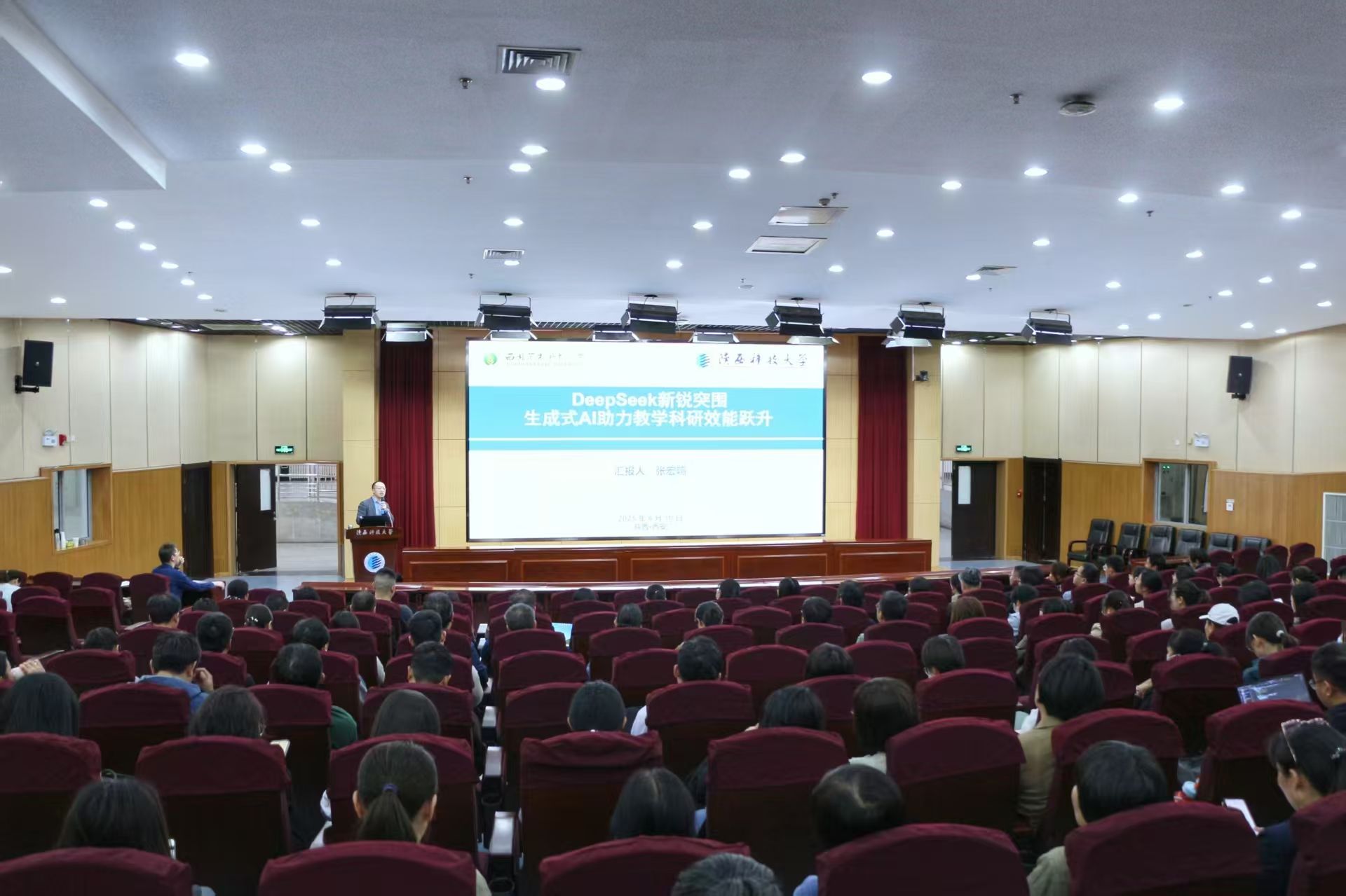 為落實學(xué)校七屆四次“雙代會”精神,扎實推進我校2025年工作要點,積極探索“人工智能+”教育教學(xué)新模式,提升我校教師教學(xué)科研能力,教師發(fā)展中心“人工智能賦能教育教學(xué)創(chuàng)新”系列專題培訓(xùn)拉開帷幕。首場報告特邀陜西省教學(xué)名師、西北農(nóng)林科技大學(xué)張宏鳴教授作題為《DeepSeek新銳突圍,生成式AI助力教學(xué)科研效能躍升》的專題報告。報告會由教師發(fā)展中心常務(wù)副主任徐永建主持,我校300余名教師聆聽了此次報告會。