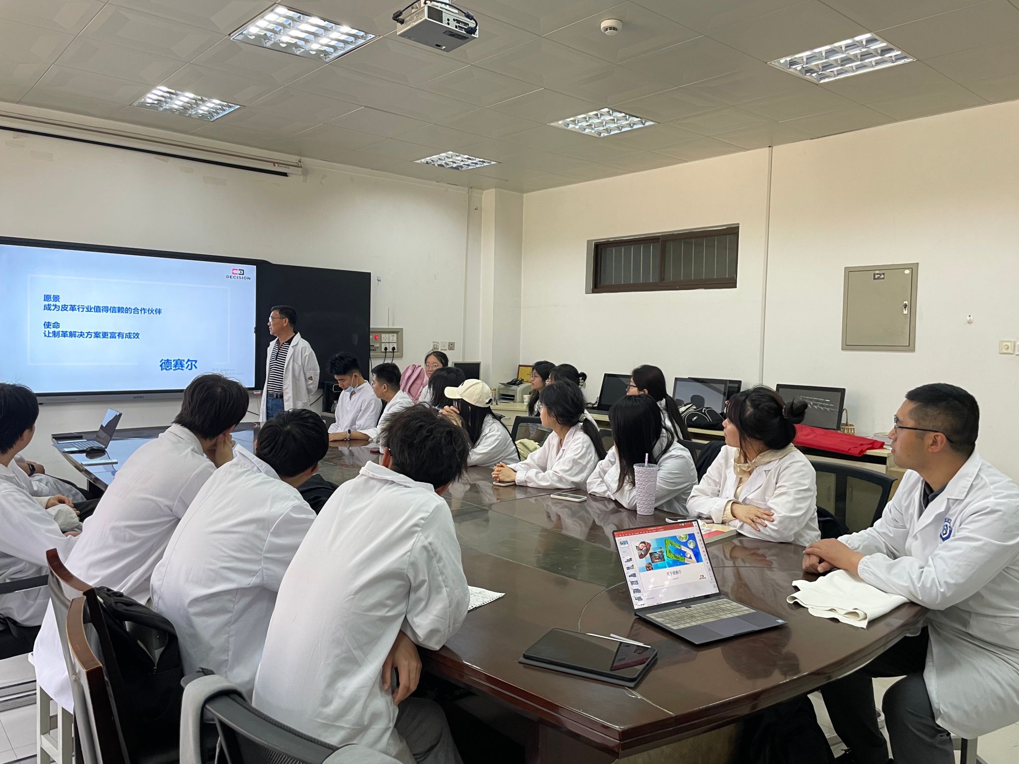4 月 18-20 日,輕工科學與工程學院皮革系特邀四川德賽爾新材料科技有限公司開展技術(shù)交流與演示活動,該公司水場技術(shù)主管吳仲蓬經(jīng)理與校內(nèi)指導(dǎo)教師一起,指導(dǎo)了輕化工程專業(yè) 22 級學生的制革濕整飾實驗,并進行了無鉻鞣技術(shù)交流與演示活動。此次活動讓學院師生深入了解了制革的前沿技術(shù),同時也 拓展了專業(yè)視野。 在專題講座環(huán)節(jié),吳仲蓬經(jīng)理以《德賽爾DWT/CFW無鉻鞣體系》為題, 介紹了四川德賽爾新材料科技有限公司的基本概況和該公司 DWT/CFW 無鉻鞣體系的技術(shù)特點。通過豐富、詳實的講解,讓師生們?nèi)媪私饬四壳笆袌鲋髁鳠o鉻鞣技術(shù)的特點、應(yīng)用領(lǐng)域和發(fā)展趨勢。