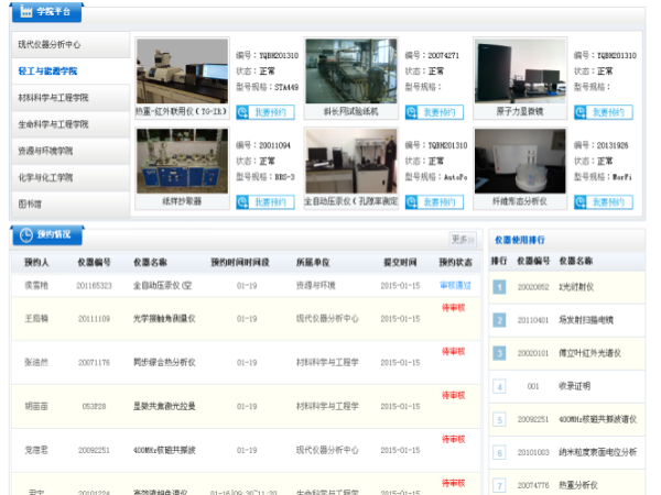 我校大型儀器設(shè)備開放共享系統(tǒng),以提高設(shè)備投資效益為目的,打破了空間限制、地域界限、部門界限,實(shí)現(xiàn)了儀器預(yù)約、實(shí)時(shí)監(jiān)控、設(shè)備維修、在線交流、數(shù)據(jù)統(tǒng)計(jì)等功能,很好的解決了以往我校實(shí)驗(yàn)室管理工作中的各項(xiàng)疑難問題。通過網(wǎng)上預(yù)約管理系統(tǒng),提高了設(shè)備儀器的使用率,有效避免了設(shè)備重復(fù)購置,實(shí)現(xiàn)了實(shí)驗(yàn)室資源開放共享,通過實(shí)驗(yàn)室工作和設(shè)備量化考核,加強(qiáng)并規(guī)范了實(shí)驗(yàn)室建設(shè)和管理,為實(shí)驗(yàn)教學(xué)和科學(xué)研究提供了良好的服務(wù)平臺(tái)。