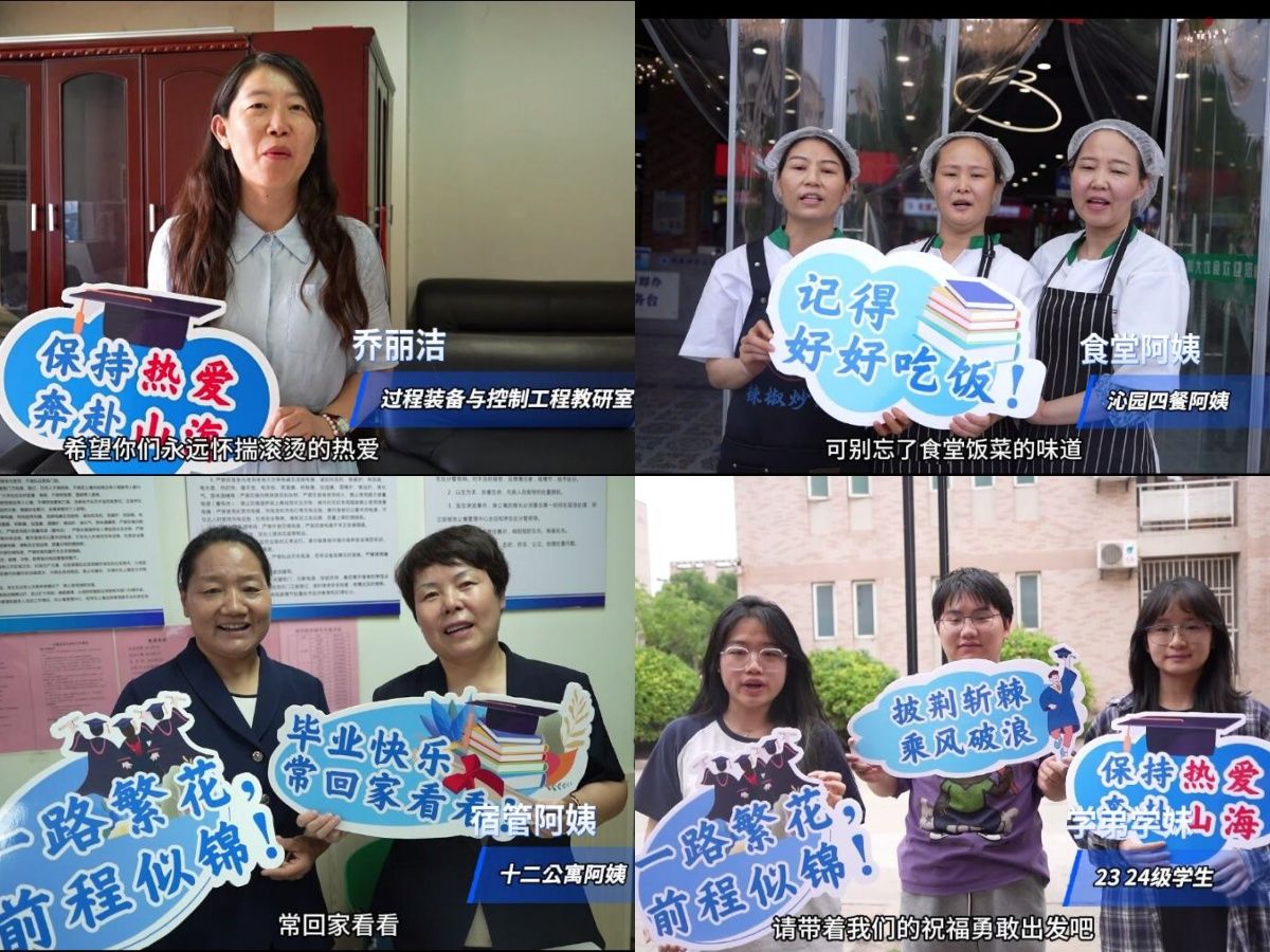 青春相伴憶芳華,畢業(yè)啟航送祝福。當(dāng)蟬鳴攀上盛夏,又是鳳凰花開的季節(jié)。學(xué)院網(wǎng)絡(luò)文化中心用鏡頭記錄教研室老師、學(xué)弟學(xué)妹、食堂阿姨、宿管阿姨、保安叔叔對(duì)畢業(yè)生的深深祝福。有青春相伴的珍貴回憶,有前程似錦的真摯祝福,有“好好吃飯,天冷加衣”的暖心叮嚀,更有“畢業(yè)快樂,一路順風(fēng)”的溫情祝福與囑托。希望畢業(yè)生們帶著這些溫暖與力量觸碰山間的紋理,激蕩熱愛和勇氣,在自洽的氛圍里盡情肆意。