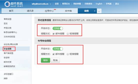 郵箱主界面,點(diǎn)擊【設(shè)置】中的【郵箱設(shè)置】,左側(cè)標(biāo)簽欄,選擇【異地登錄提醒】,把【異地登錄提醒】和【賬戶鎖定提醒】兩個開啟狀態(tài)的標(biāo)簽開啟。每次有異常登錄都會收到郵件通知和短信提醒。