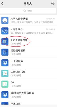 用戶(hù)首先登陸手機(jī)is科大客戶(hù)端,然后通過(guò)應(yīng)用服務(wù)中的“網(wǎng)上辦事大廳”→“乒乓球場(chǎng)地預(yù)約”進(jìn)入服務(wù):