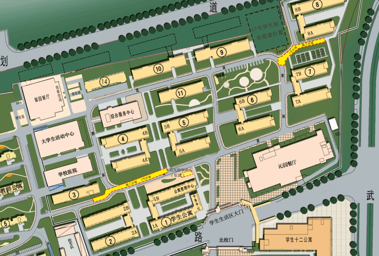 1號區(qū)域?yàn)閷W(xué)生8公寓南側(cè)道路,封閉施工時間為10月16日上午7:00,解除封閉時間為10月20日下午5:00。