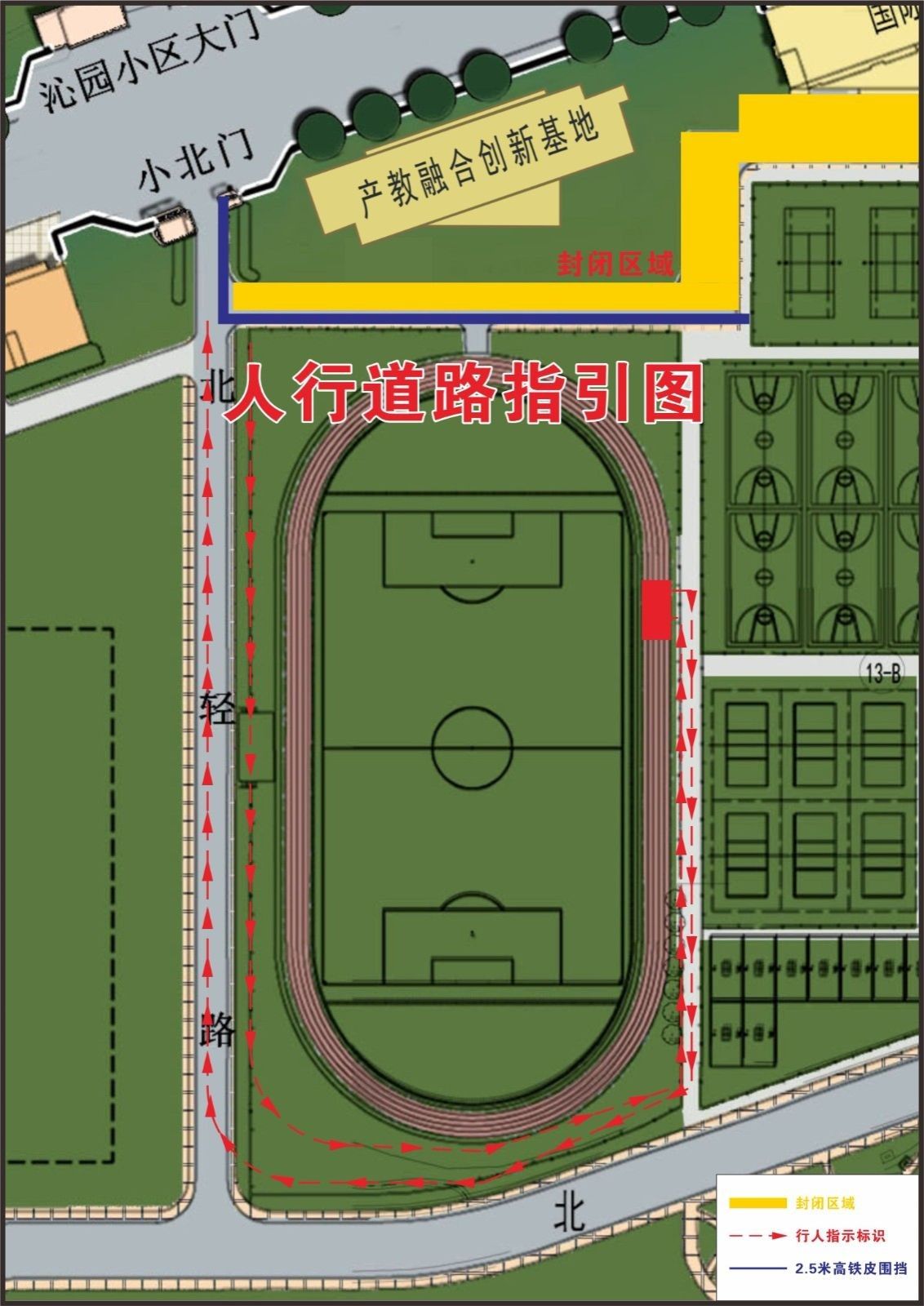 封閉期間,進(jìn)出足球場(chǎng)需臨時(shí)繞行至球場(chǎng)東入口,從封閉口西端前往餐廳需經(jīng)北輕路、北環(huán)路臨時(shí)繞行校區(qū)足球場(chǎng)東側(cè)道路。(詳見繞行指示圖)
