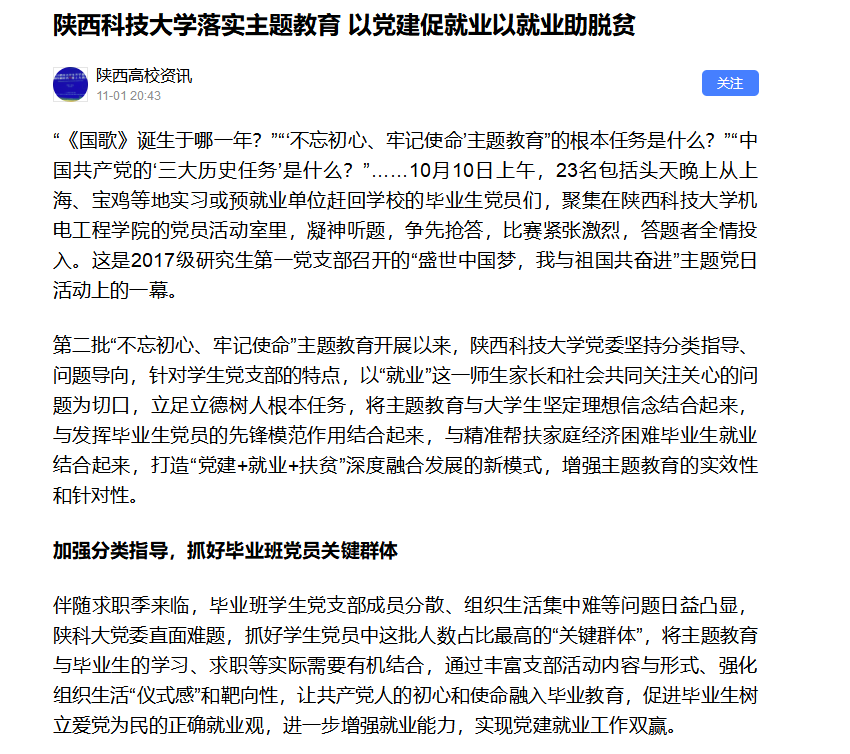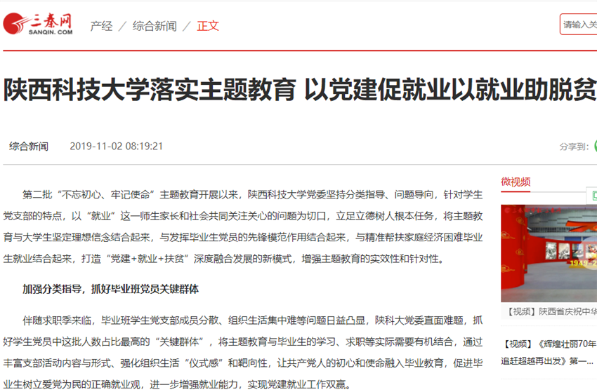 三秦網(wǎng):陜西科技大學(xué)落實主題教育 以黨建促就業(yè)以就業(yè)助脫貧