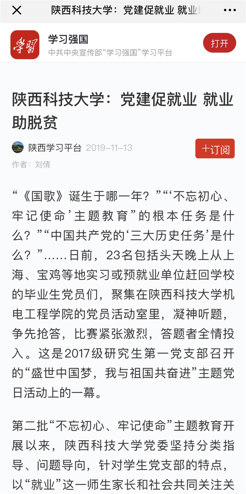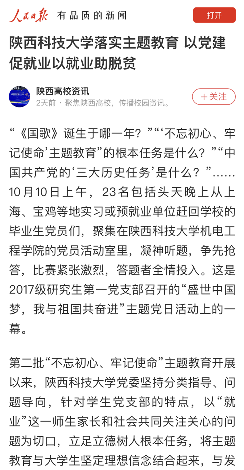 人民日報APP:陜西科技大學(xué)落實主題教育 以黨建促就業(yè)以就業(yè)助脫貧