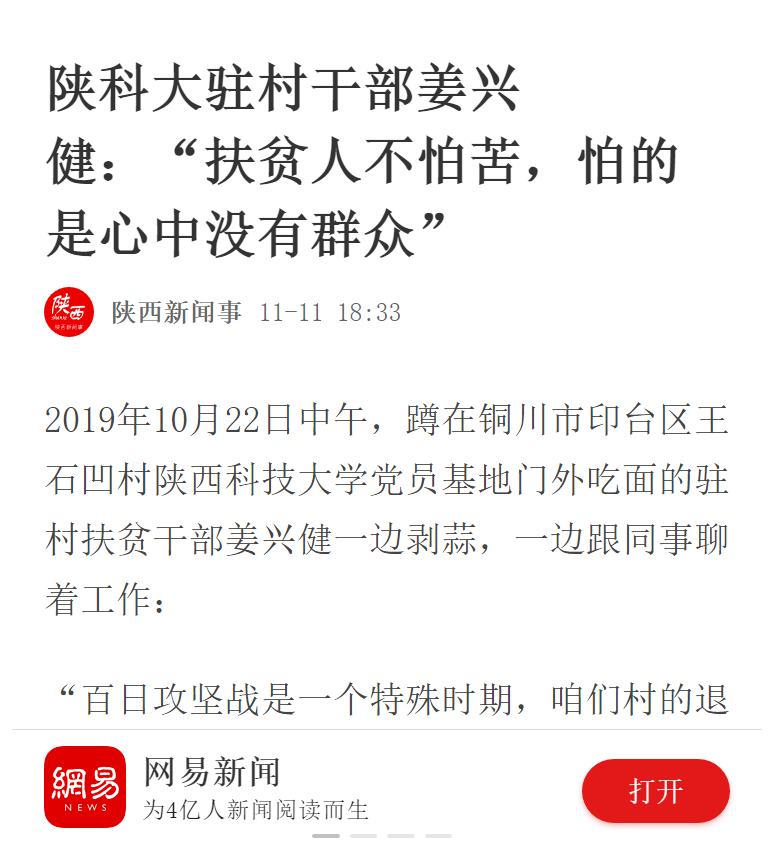 網(wǎng)易新聞:陜科大駐村干部姜興?。骸胺鲐毴瞬慌驴?,怕的是心中沒有群眾”