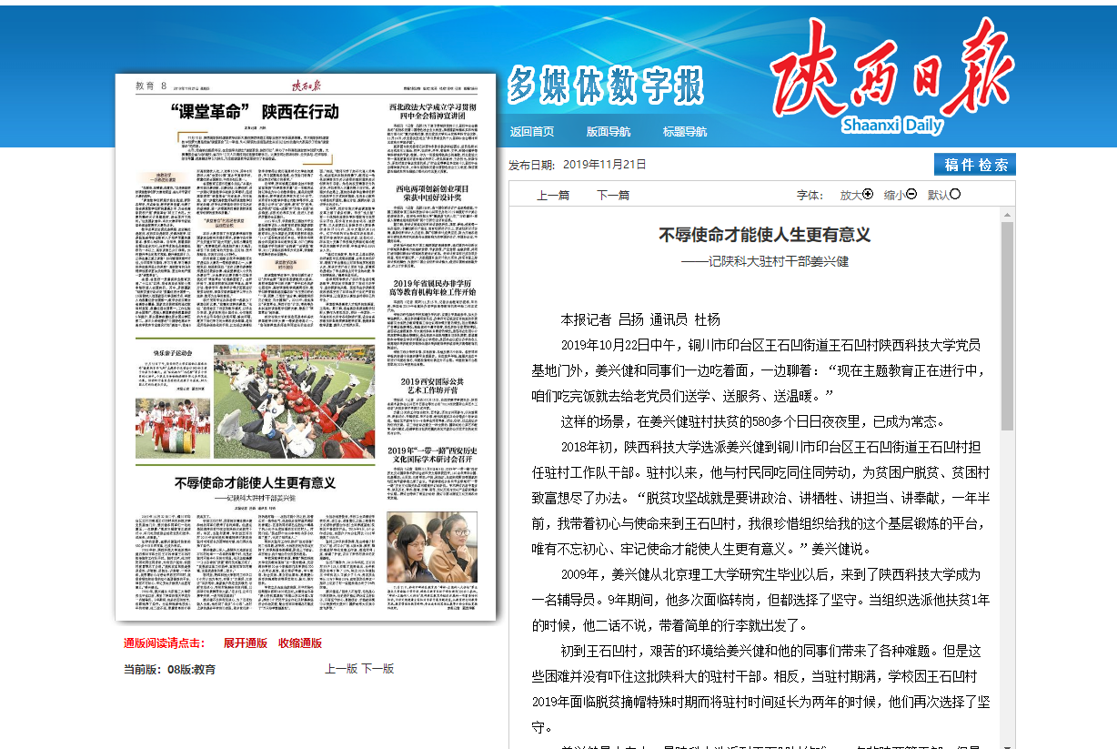 11月21日,《陜西日報(bào)》以不辱使命才能使人生更有意義--記陜科大駐村干部姜興健為題,報(bào)道了我校駐村干部姜興健駐村扶貧事跡,鏈接如下:陜西日報(bào):不辱使命才能使人生更有意義——記陜科大駐村干部姜興健