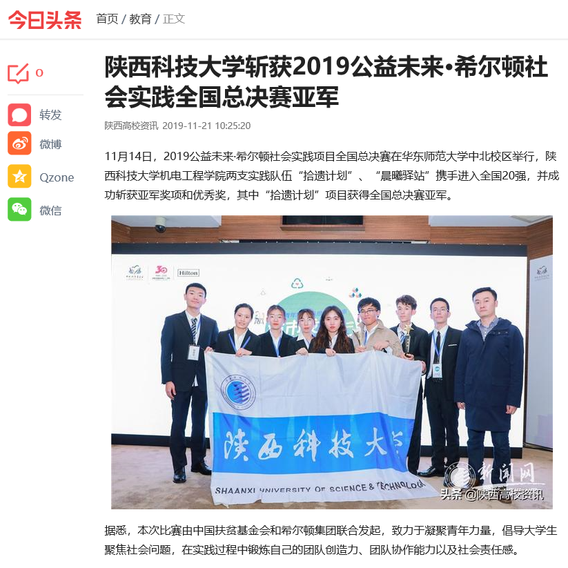 今日頭條:陜西科技大學(xué)斬獲2019公益未來·希爾頓社會實(shí)踐全國總決賽亞軍
