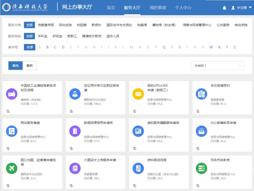 秉持“讓信息多跑路,讓師生少跑腿”原則,網(wǎng)絡(luò)與管理中心在校園網(wǎng)推出“網(wǎng)上辦事大廳”服務(wù),一改拿著審批單到處找各部門簽字的費時費力,師生只需在電腦或者手機上“點一點”,即刻發(fā)起辦事流程,還能關(guān)注審批進度,隨時隨地“掌中”辦事。經(jīng)過與多個職能部門的反復溝通、制作、測試,“網(wǎng)上辦事大廳”目前已建事項60余項,發(fā)布事項24項,涉及黨委宣傳部、校團委、研究生院、國際處、檔案館、中國輕工業(yè)博物館等部門,包含采訪報道預約、橫幅懸掛申請、研究生寒暑假留校申請、博物館參觀預約、簽證用中英文在職證明、校團委用印、檔案查閱、專利證書領(lǐng)用、站群子站申請、學生郵箱激活等事項的申請和審批流程。過去往往需要跑一天才能完結(jié)的事務(wù),在“網(wǎng)上辦事大廳”最快幾分鐘就能能得到解決。截至目前,服務(wù)次數(shù)共計8107次,服務(wù)人數(shù)達3464人。