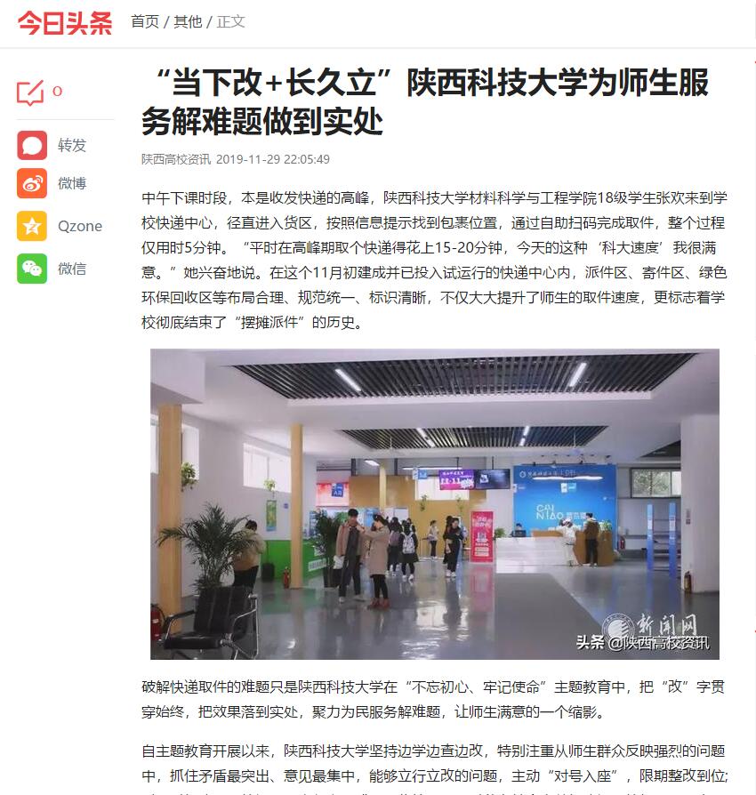 破解快遞取件的難題只是陜西科技大學在“不忘初心、牢記使命”主題教育中,把“改”字貫穿始終,把效果落到實處,聚力為民服務(wù)解難題,讓師生滿意的一個縮影。
