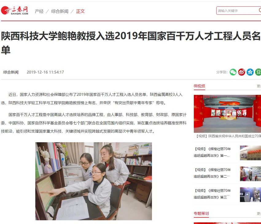 網(wǎng)易新聞:陜西科技大學(xué)鮑艷教授入選2019年國家百千萬人才工程人員名單