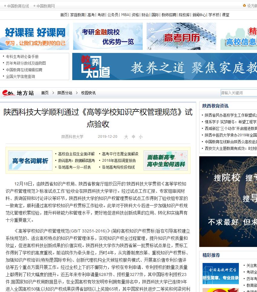 中國教育在線:陜西科技大學(xué)順利通過《高等學(xué)校知識產(chǎn)權(quán)管理規(guī)范》試點驗收