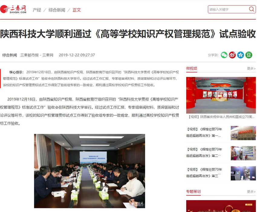 近日,三秦網(wǎng)、網(wǎng)易新聞APP等媒體紛紛報道我校順利通過《高等學(xué)校知識產(chǎn)權(quán)管理規(guī)范》試點驗收。