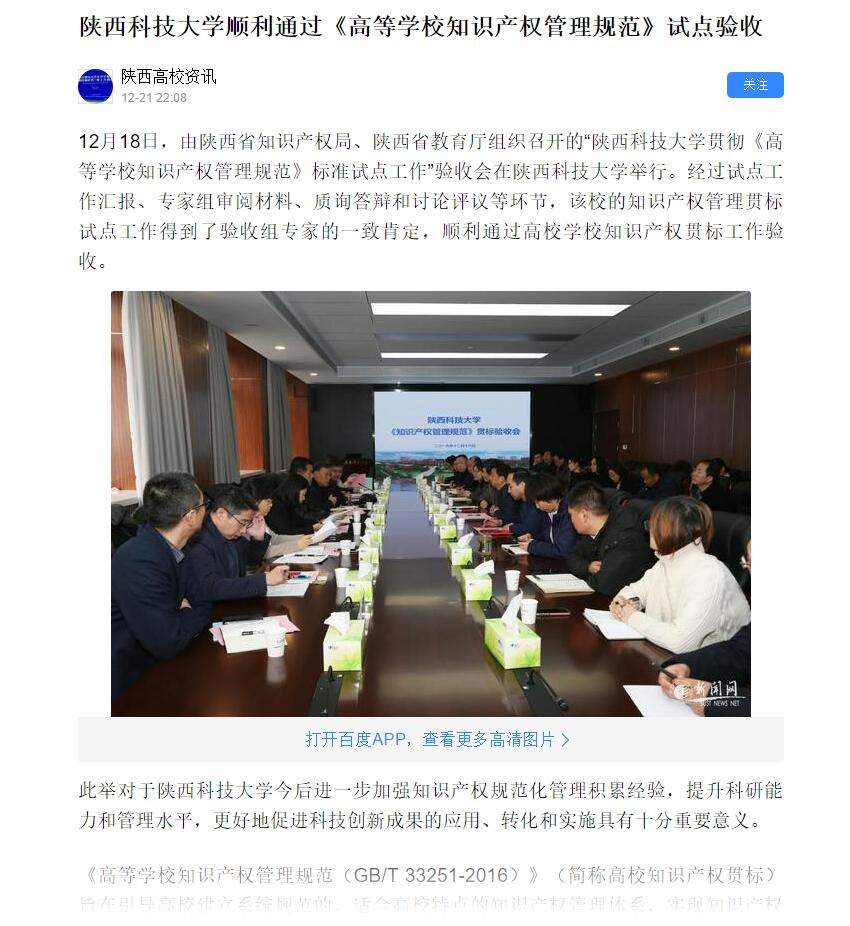 百度APP:陜西科技大學(xué)順利通過《高等學(xué)校知識產(chǎn)權(quán)管理規(guī)范》試點驗收