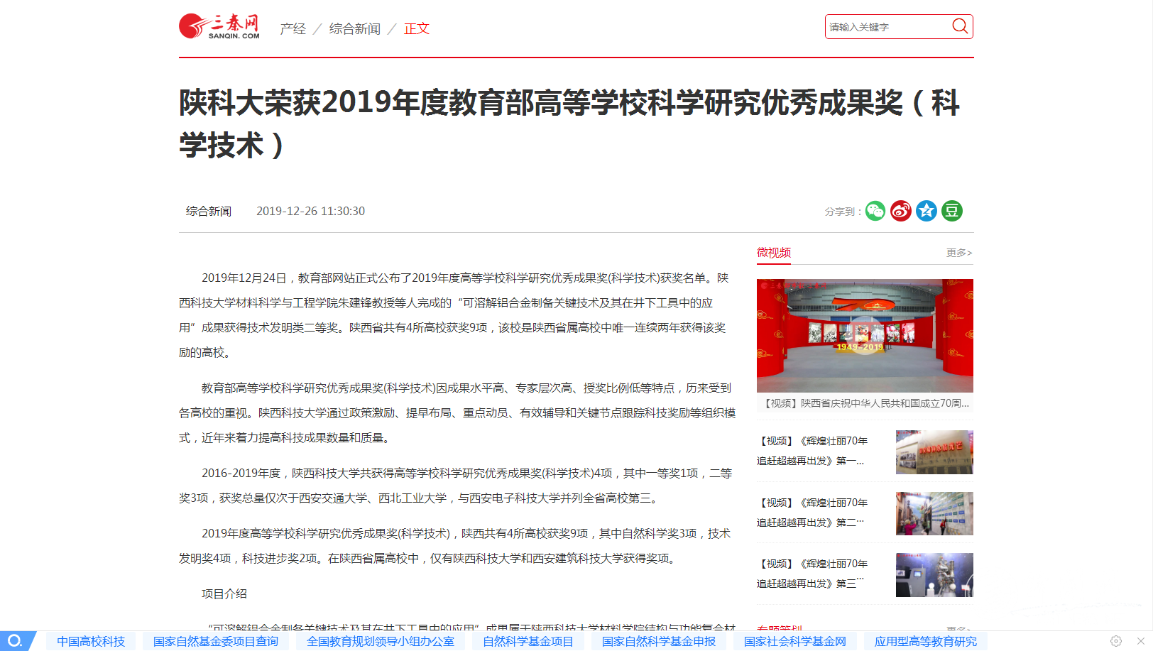 近日,三秦網(wǎng)、人民日?qǐng)?bào)App、今日頭條、陜西高校資訊、中國青年網(wǎng)等媒體紛紛報(bào)道陜科大獲2019年度教育部高等學(xué)校科學(xué)研究優(yōu)秀成果獎(jiǎng)(科學(xué)技術(shù))