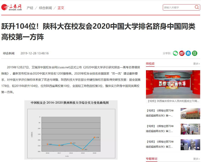 三秦網(wǎng):躍升104位!陜科大在校友會2020中國大學(xué)排名躋身中國同類高校第一方陣