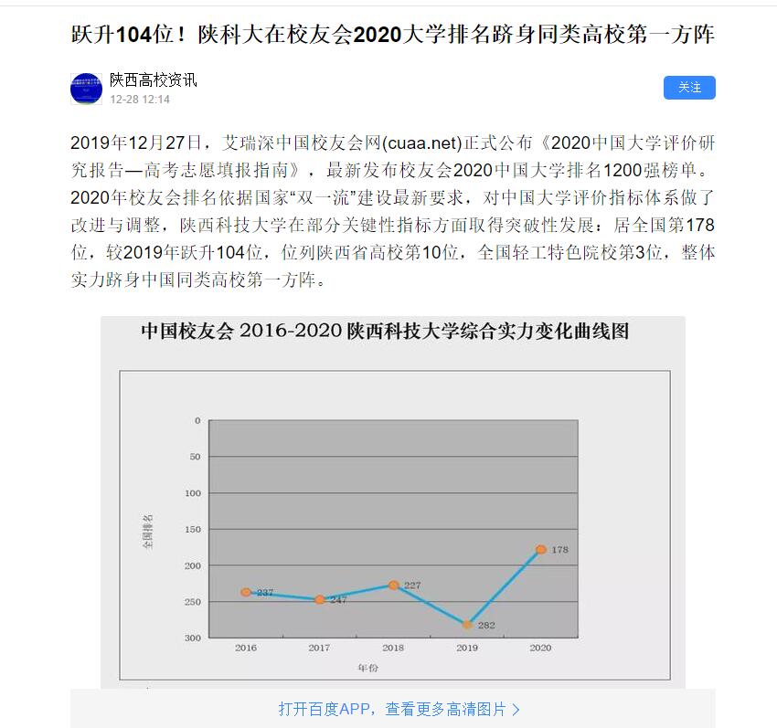 百度APP:躍升104位!陜科大在校友會2020大學(xué)排名躋身同類高校第一方陣