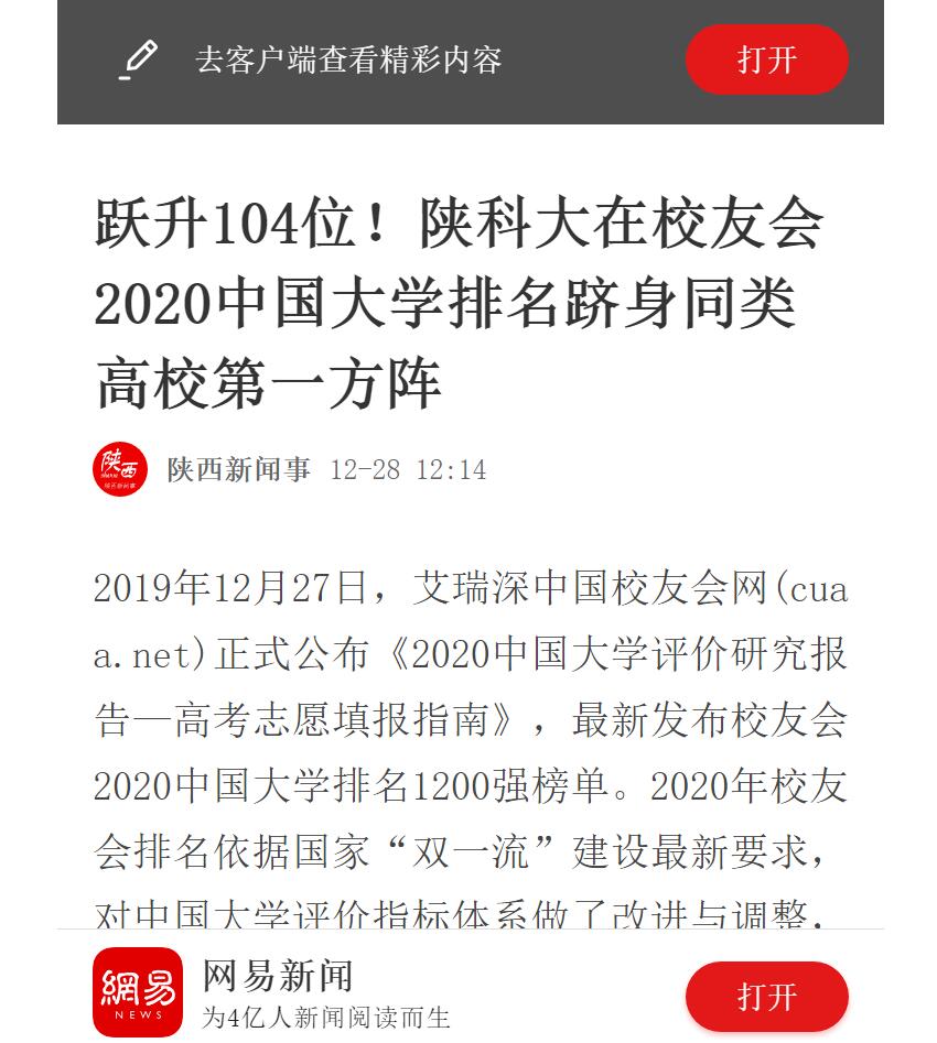 網(wǎng)易新聞APP:躍升104位!陜科大在校友會2020中國大學(xué)排名躋身同類高校第一方陣