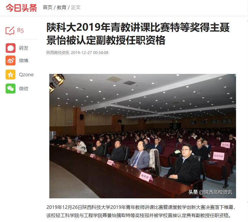 今日頭條APP:陜科大2019年青教講課比賽特等獎得主聶景怡被認(rèn)定副教授任職資格