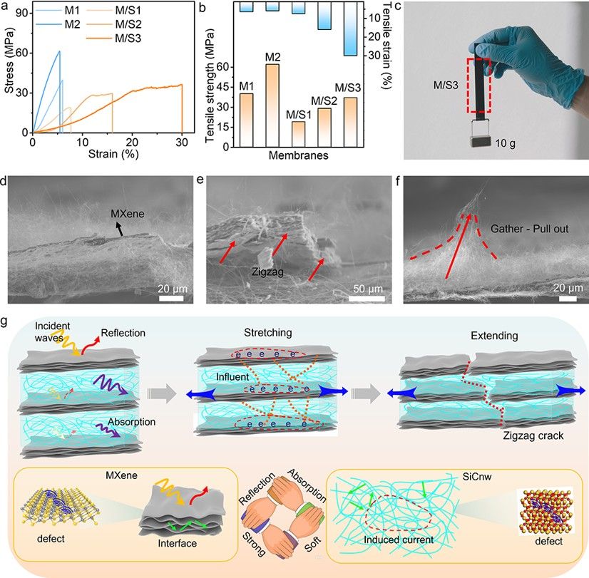 圖4 a) 復(fù)合薄膜的應(yīng)力-應(yīng)變曲線;b) 復(fù)合薄膜的拉伸強(qiáng)度和應(yīng)變;c) 承受10 g重量的M/S3復(fù)合薄膜的照片;d) M/S3復(fù)合薄膜的斷裂行為;e) MXene層的鋸齒狀階梯狀裂紋區(qū)域;f) SiCnw三維網(wǎng)絡(luò)的聚集-拔出;g) M/S3復(fù)合薄膜的拉伸、斷裂和電磁屏蔽機(jī)制