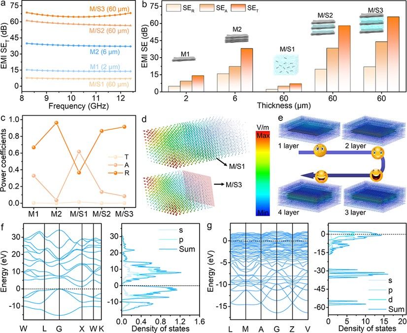 圖3 a) 復(fù)合薄膜的X波段電磁屏蔽效率;b) 復(fù)合薄膜的SET、SER和SEA的平均值;c)復(fù)合薄膜的R、A和T的功率系數(shù);d)樣品的模擬屏蔽效能;e) 不同電容器結(jié)構(gòu)的復(fù)合薄膜對電磁波的影響;f) 含缺陷SiC的能帶結(jié)構(gòu)和態(tài)密度;g) MXene/SiC能帶結(jié)構(gòu)和態(tài)密度