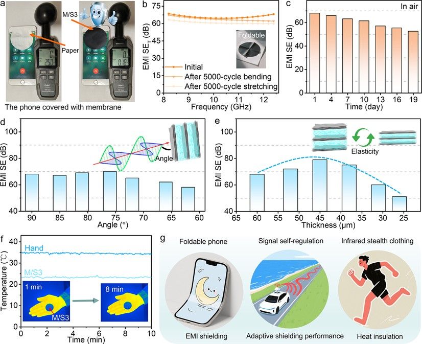 圖5 a) M/S3膜的屏蔽應(yīng)用;b) M/S3膜拉伸彎曲后屏蔽性能的變化;c) M/S3膜隨時(shí)間的性能趨勢;d) 不同角度和e) 不同壓縮厚度下M/S3膜的電磁干擾屏蔽性能;f) 隨時(shí)間變化的紅外圖像;g) M/S3膜的潛在應(yīng)用