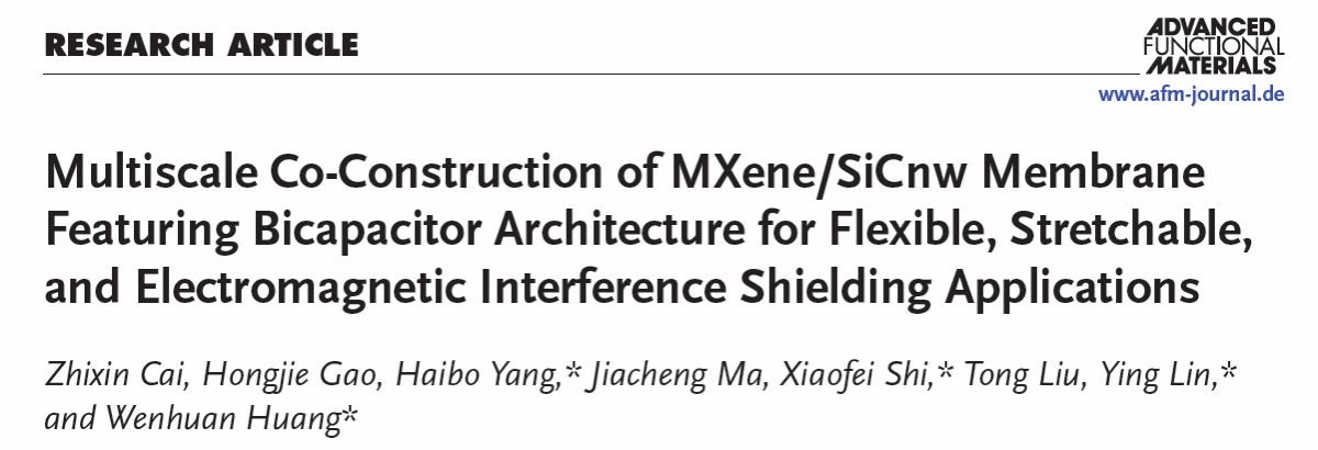 近日,材料科學(xué)與工程學(xué)院楊海波教授團(tuán)隊(duì),在國際頂級期刊《Advanced Functional Materials》(IF:19)上發(fā)表了題為“Multiscale Co-Construction of MXene/SiCnw Membrane Featuring Bicapacitor Architecture for Flexible, Stretchable, and Electromagnetic Interference Shielding Applications”的研究論文。陜西科技大學(xué)楊海波教授、林營教授、黃文歡教授和中國建筑材料科學(xué)研究總院有限公司石曉飛高級工程師為文章共同通訊作者,陜西科技大學(xué)材料學(xué)院博士后蔡志新為文章第一作者,陜西科技大學(xué)為第一通訊單位。