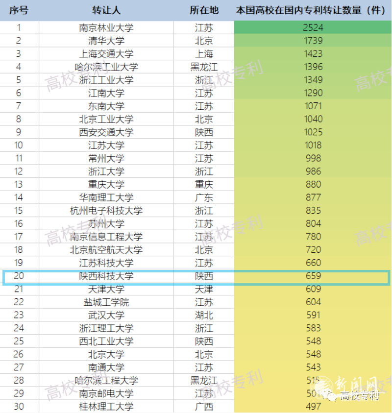 近日,高校專利公眾號發(fā)布“最新中國高校專利轉(zhuǎn)讓榜單(TOP100)”(下文簡稱“榜單”),我校以轉(zhuǎn)讓659件居全國排名第20位,陜西高校第2位,省屬高校第1位。這是繼我校獲得國家知識產(chǎn)權(quán)試點高校后,進(jìn)一步深化實施創(chuàng)新驅(qū)動戰(zhàn)略,強(qiáng)化知識產(chǎn)權(quán)創(chuàng)造、保護(hù)和運用,扎實推進(jìn)科技成果轉(zhuǎn)移轉(zhuǎn)化的又一次突破。