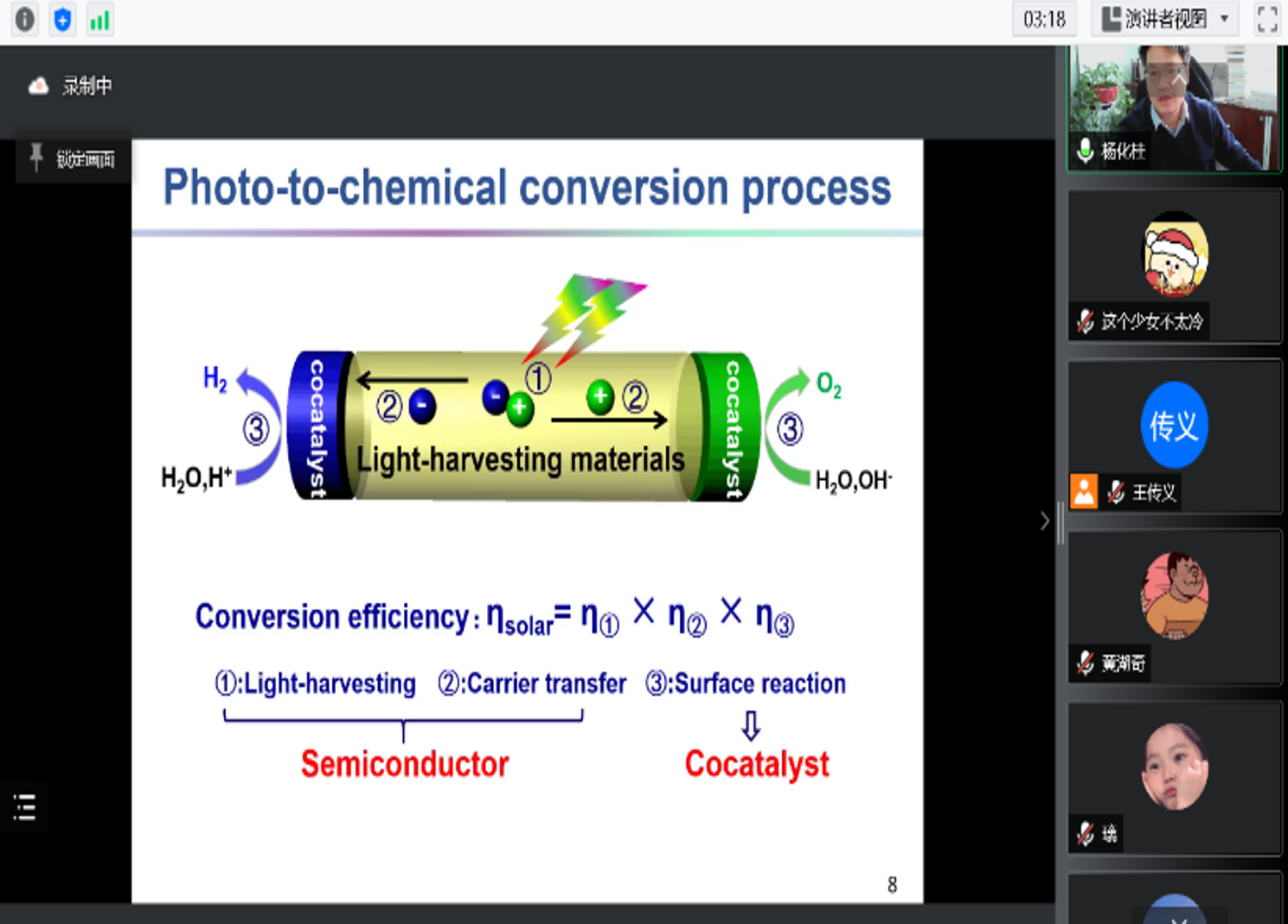 楊化桂作了題為“光化學能轉換功能材料”的報告,從“拓寬光吸收范圍及增強載流子傳輸能力”“揭示助催化材料活性位點及構建篩選策略”“應用operando裝置及探測實時反應信息”等方面,系統(tǒng)介紹了其在光化學能轉換材料結構設計、光能利用及機理機制等方面的研究成果。