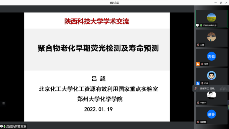 1月19日下午,受我校輕工科學(xué)與工程學(xué)院、科技處及前沿院邀請(qǐng),北京化工大學(xué)呂超教授做客我?!扒把乜茖W(xué)報(bào)告”,作了題為“聚合物老化早期熒光檢測(cè)及壽命預(yù)測(cè)”的線上學(xué)術(shù)報(bào)告。報(bào)告會(huì)由輕工學(xué)院院長(zhǎng)呂斌主持,學(xué)院相關(guān)專(zhuān)業(yè)教師及研究生參加了本次學(xué)術(shù)報(bào)告會(huì)。