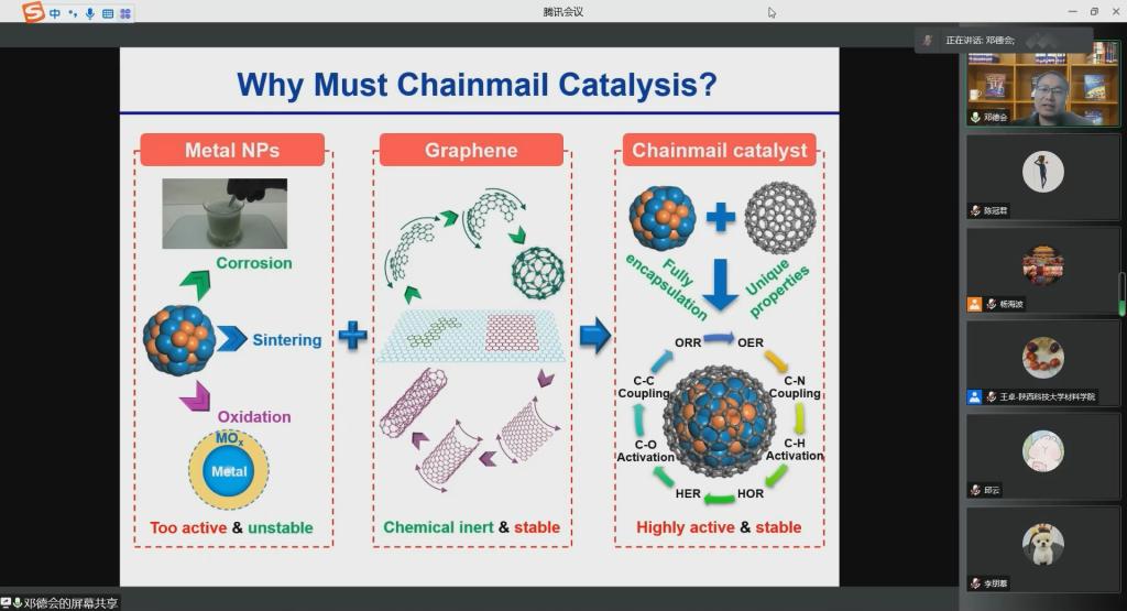 1月19日上午,應(yīng)我??萍继帯⑶把卦汉筒牧峡茖W(xué)與工程學(xué)院邀請,大連化物所鄧德會研究員做客我?!扒把乜茖W(xué)報告”,作了題為“鎧甲催化:從概念到應(yīng)用”的線上學(xué)術(shù)報告。報告由教務(wù)處處長楊海波教授主持,材料學(xué)院部分師生參加了此次學(xué)術(shù)報告會。