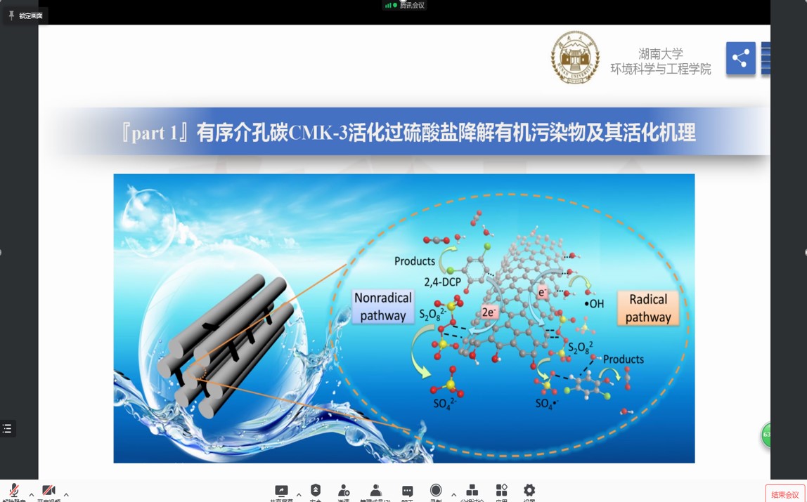 王佳佳博士首先介紹了有機(jī)污染水處理技術(shù)的發(fā)展現(xiàn)狀及過硫酸鹽高級氧化體系在水處理方面的應(yīng)用前景,詳細(xì)介紹了有序介孔碳CMK-3、再造紙衍生的氮摻雜生物炭、碳包裹的Mn3O4復(fù)合納米立方體活化過硫酸鹽去除有機(jī)污染物方面的研究內(nèi)容,并對氧化過程中可能發(fā)生的降解機(jī)理做了重點(diǎn)分析。