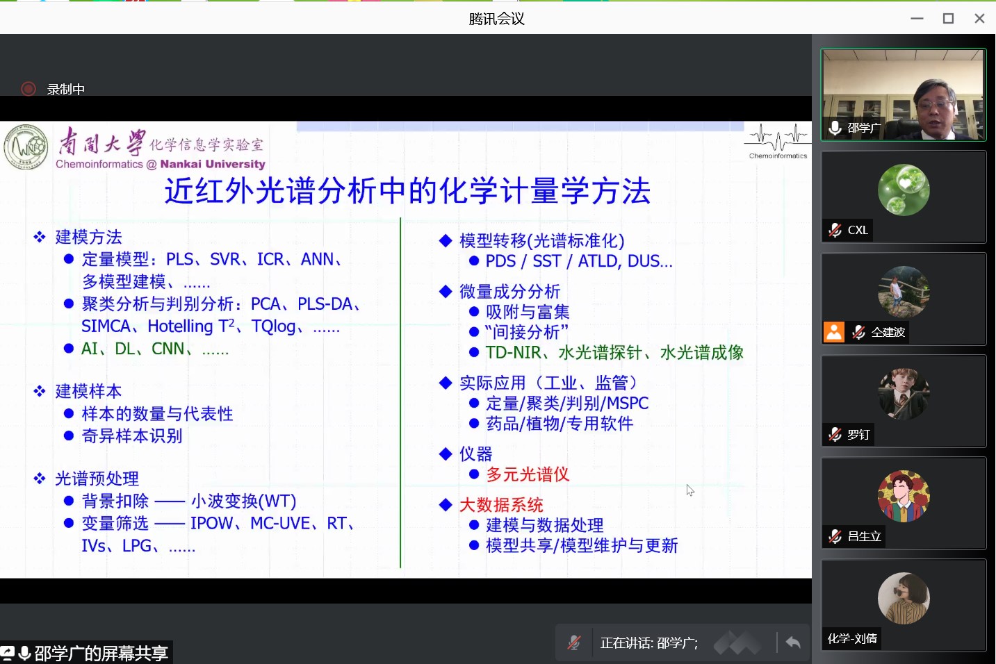 邵學(xué)廣教授主要報告了采用水的近紅外光譜信號作為探針分析體系的組成、結(jié)構(gòu)及含量進(jìn)行探測;并介紹了溫控近紅外光譜分析技術(shù)對目標(biāo)物的含量和結(jié)構(gòu)進(jìn)行分析。重點介紹了將高維數(shù)據(jù)分析方法、化學(xué)計量學(xué)方法和分子模擬技術(shù)等與水的近紅外光譜結(jié)合分析,實現(xiàn)了水的不同結(jié)構(gòu)形式以及水光譜的精細(xì)結(jié)構(gòu)信息,并研究了蛋白質(zhì)和聚合物的熱變性過程。報告最后,邵學(xué)廣教授就師生們對于FMA算法的局限性、動力學(xué)模擬在化學(xué)計量學(xué)中的應(yīng)用等相關(guān)問題進(jìn)行了細(xì)致解答。