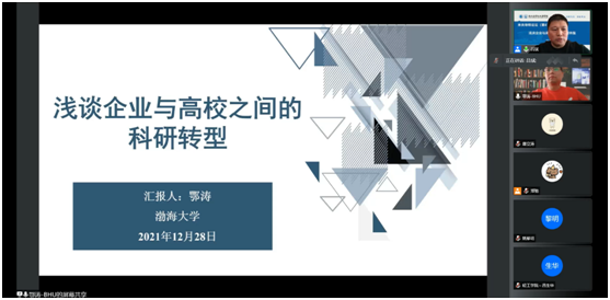12月28日下午,應我校輕工科學與工程學院和研究生院邀請,渤海大學鄂濤教授做客我?!拔囱雽熣搲?,并作了題為“淺談企業(yè)與高校之間的科研轉(zhuǎn)型”的報告。報告由輕工學院院長呂斌教授主持,學院相關(guān)教師和學生參加了本次報告會。受疫情影響,本次報告采取線上會議方式進行。