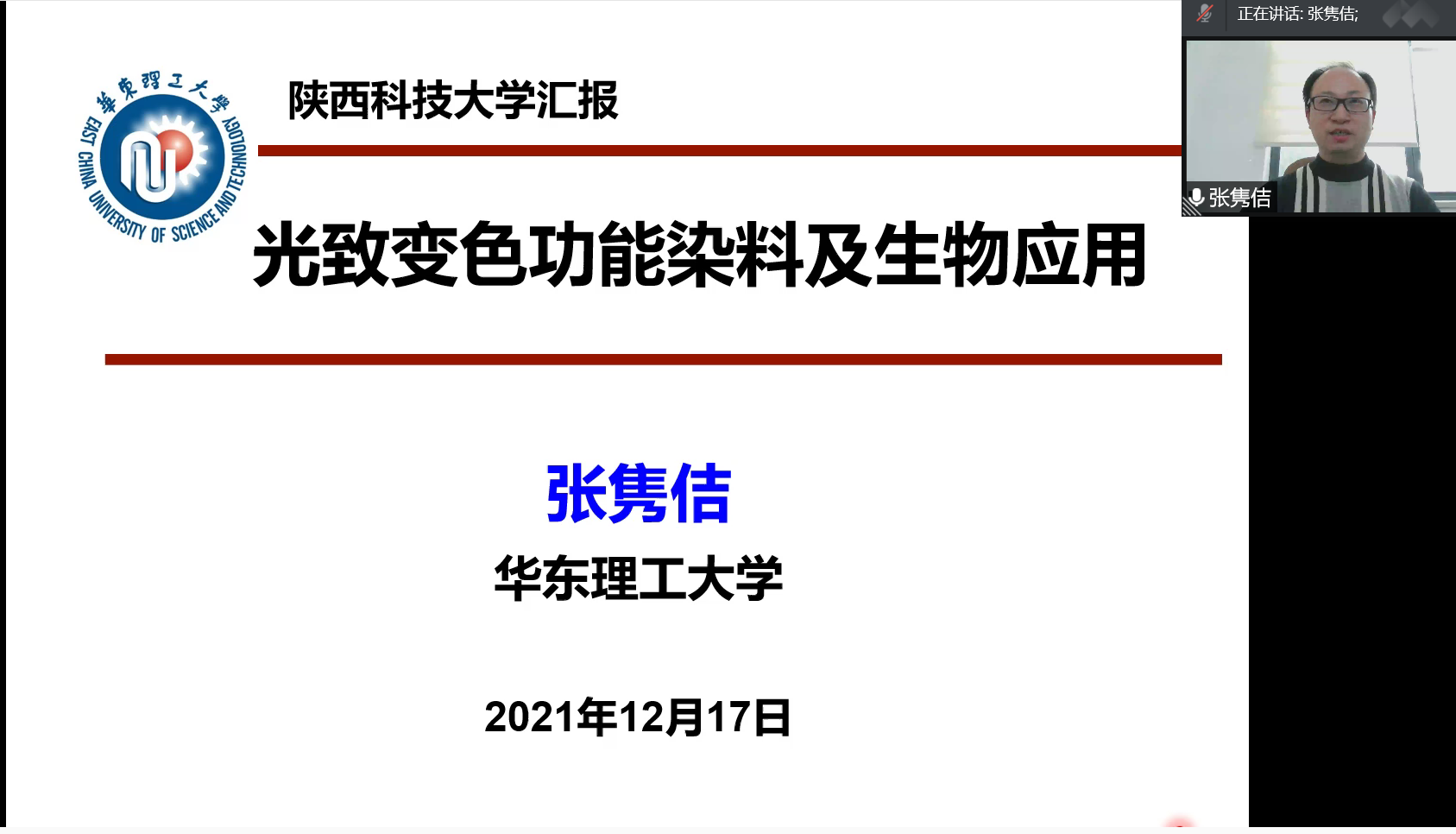 12月17日下午,應(yīng)我校輕工科學(xué)與工程學(xué)院、科技處及前沿院邀請,國家級人才稱號獲得者、華東理工大學(xué)張雋佶副教授做客我?!扒把乜茖W(xué)報(bào)告”,作了題為《光致變色功能染料及生物應(yīng)用研究》的報(bào)告。報(bào)告由輕工學(xué)院院長呂斌主持,輕工學(xué)院教師和研究生、本科生參加了此次報(bào)告。