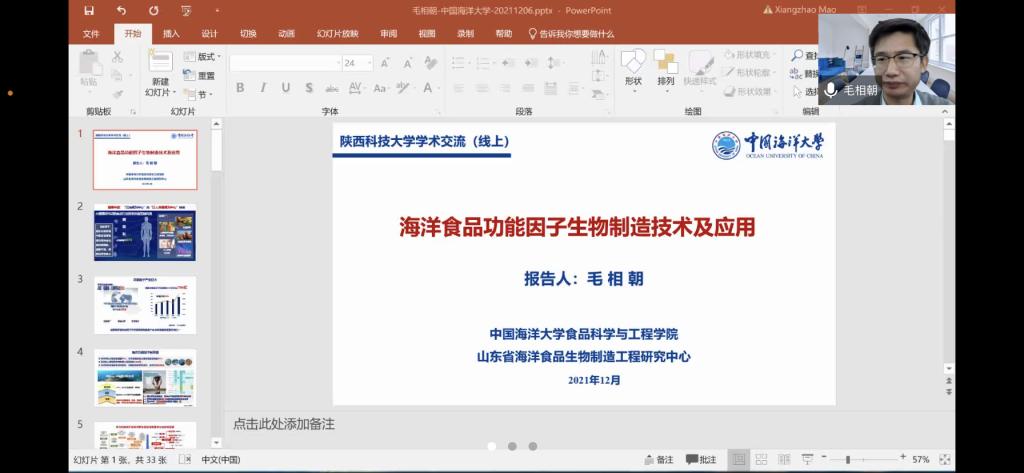 12月9日,中國海洋大學(xué)毛相朝教授應(yīng)邀做客我校前沿科學(xué)報(bào)告,以“海洋功效因子的生物制造技術(shù)及應(yīng)用”為題進(jìn)行學(xué)術(shù)報(bào)告,因疫情影響,采取線下會(huì)場(chǎng)和線上騰訊會(huì)議兩種方式進(jìn)行,報(bào)告會(huì)由食品與生物工程學(xué)院副院長(zhǎng)李國梁教授主持,食品學(xué)院教師和研究生代表參加了本次報(bào)告會(huì)。