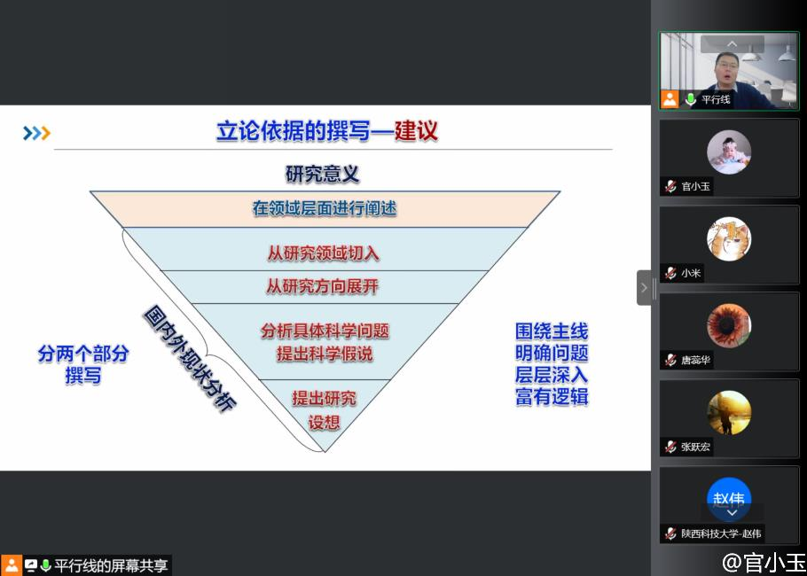 2月17日上午,受我校輕工科學(xué)與工程學(xué)院、科技處、前沿院邀請(qǐng),空軍軍醫(yī)大學(xué)張偉教授做客我?!扒把乜茖W(xué)報(bào)告”,作了題為“國(guó)家自然科學(xué)基金撰寫技巧及注意事項(xiàng)”的報(bào)告。報(bào)告會(huì)由輕工學(xué)院副院長(zhǎng)劉國(guó)棟主持,線上線下同時(shí)進(jìn)行,輕工學(xué)院部分專任教師參加了本次報(bào)告會(huì)。