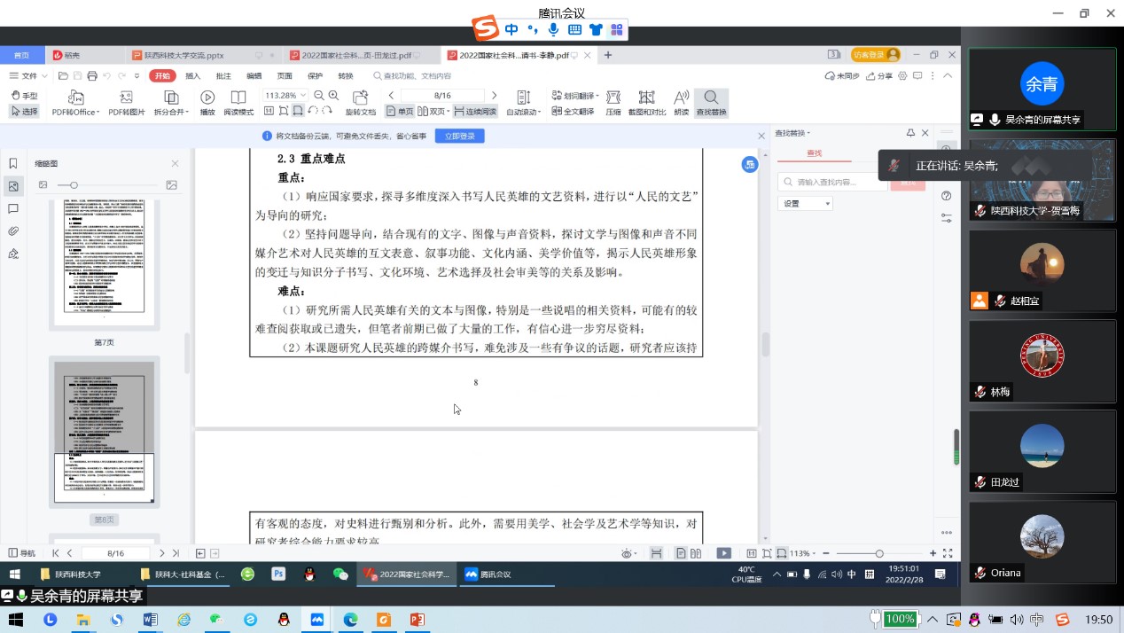 2月28日晚,應(yīng)設(shè)計(jì)與藝術(shù)學(xué)院與科技處邀請,湖南師范大學(xué)吳余青教授云端做客我?!扒把乜茖W(xué)報(bào)告”,作了題為“國家社科基金項(xiàng)目申報(bào)論證輔導(dǎo)”的學(xué)術(shù)報(bào)告。報(bào)告會由設(shè)藝學(xué)院副院長賀雪梅教授主持,學(xué)院部分教師聆聽了此次精彩分享。