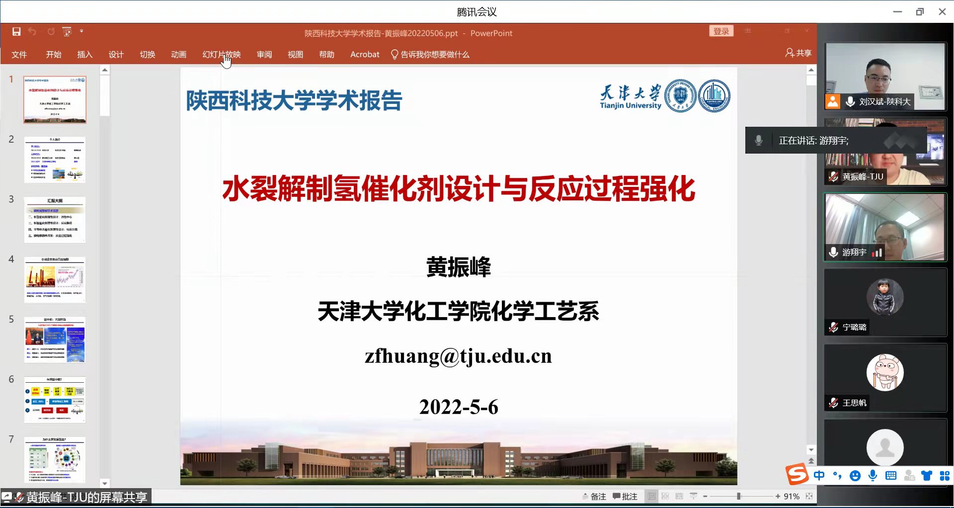 5月6日下午,應我校輕工科學與工程學院、科技處及前沿院邀請,天津大學黃振峰教授做客我校前沿科學報告,作了題為“水裂解制氫催化劑設計與反應過程強化”的線上學術報告。報告會由輕工學院院長助理游翔宇主持,學院相關專業(yè)教師及部分研究生聆聽了此次報告會。