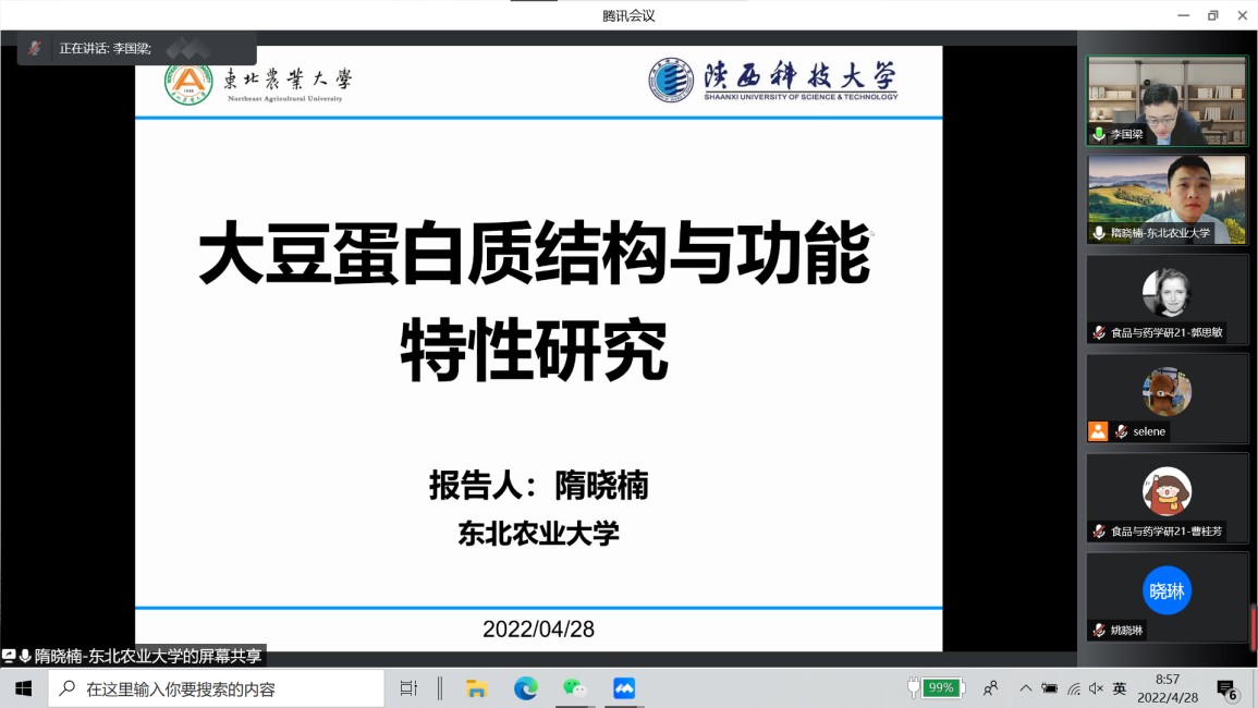 報(bào)告結(jié)束后,隋曉楠教授與師生就相關(guān)問題進(jìn)行了溝通交流,對(duì)提出的問題進(jìn)行了探討和解答。李國梁老師做了總結(jié)發(fā)言,并對(duì)隋曉楠教授的精彩報(bào)告表示真摯的感謝。本次學(xué)術(shù)交流活動(dòng)圓滿成功,開闊了我院師生在大豆蛋白質(zhì)方面的科學(xué)視野。