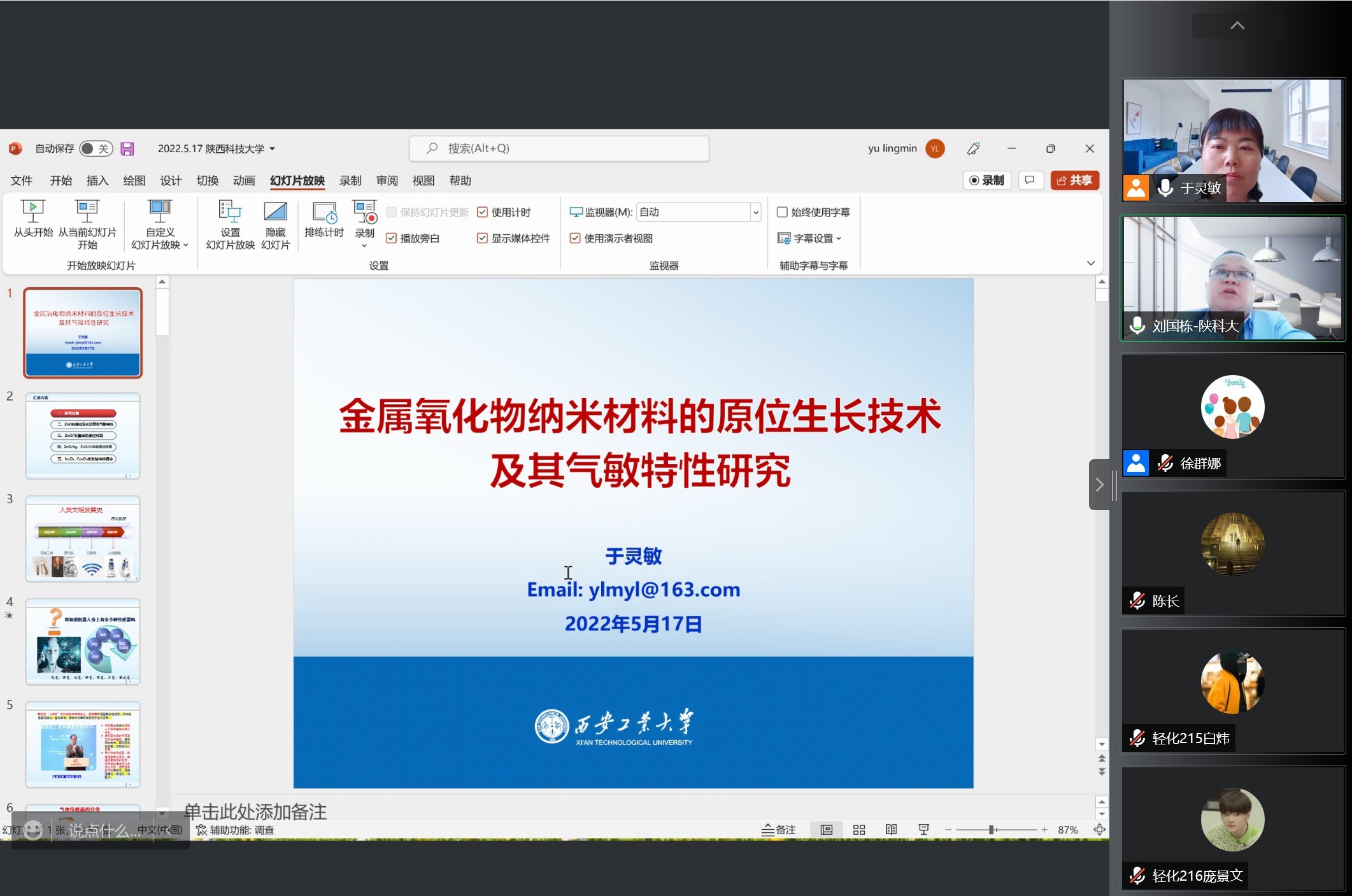 5月17日下午,應(yīng)我校輕工科學(xué)與工程學(xué)院、科技處、前沿院邀請(qǐng),西安工業(yè)大學(xué)于靈敏教授做客我校“前沿科學(xué)報(bào)告”,作了題為“金屬氧化物半導(dǎo)體納米材料的原位合成技術(shù)及氣敏特性研究”的線上報(bào)告。報(bào)告會(huì)由輕工學(xué)院副院長(zhǎng)劉國(guó)棟主持,輕工學(xué)院相關(guān)專業(yè)教師、研究生參加了此次報(bào)告會(huì)。