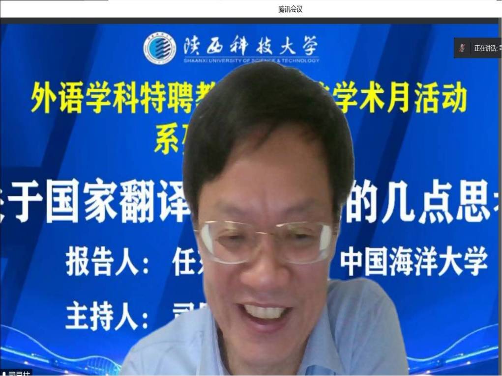 6月9日晚,中國海洋大學(xué)任東升教授應(yīng)邀做客我校“前沿學(xué)科報告”,作為我校文理學(xué)院外語學(xué)科特聘教授司顯柱學(xué)術(shù)月活動系列講座首位開講嘉賓,做了題為“關(guān)于國家翻譯實踐研究的幾點思考”的線上報告。報告由司顯柱教授主持,文理學(xué)院師生150余人聆聽了此次報告。文理學(xué)院6月組織開展的外語學(xué)科特聘教授司顯柱學(xué)術(shù)活動系列講座,旨在充分發(fā)揮我校特聘教授學(xué)術(shù)引領(lǐng)和資源共享作用,推動我校外語學(xué)科內(nèi)涵發(fā)展。