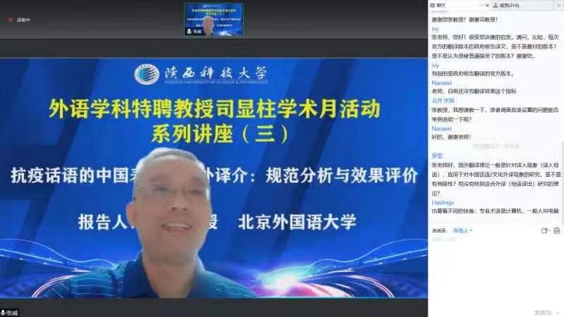 6月15日,北京外國語大學(xué)張威教授做客我?!扒把乜茖W(xué)報告”,做了題為“抗疫話語的中國表達與對外譯介:規(guī)范分析與效果評價”的線上報告。報告由我校特聘教授司顯柱主持,參會人數(shù)達260余人。文理學(xué)院6月組織開展的外語學(xué)科特聘教授司顯柱學(xué)術(shù)活動系列講座,旨在充分發(fā)揮我校特聘教授學(xué)術(shù)引領(lǐng)和資源共享作用,推動我校外語學(xué)科內(nèi)涵發(fā)展。