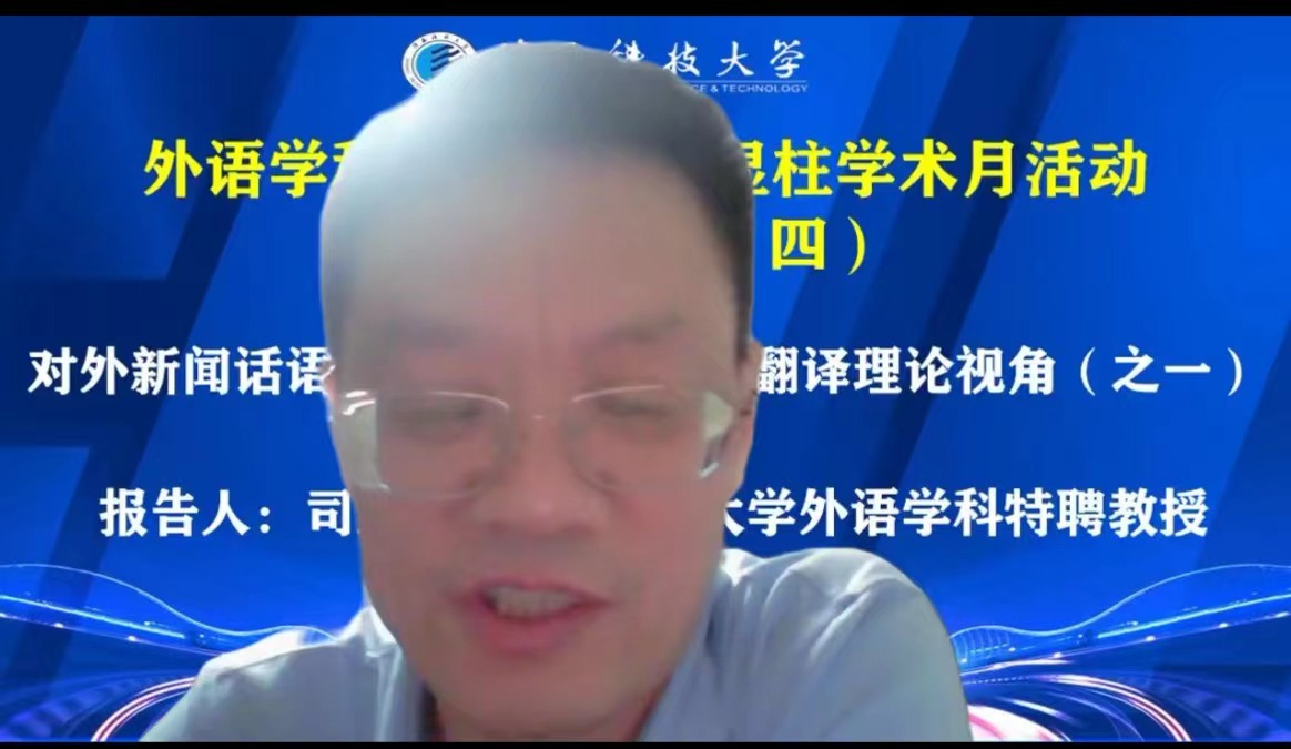 6月16日,我校特聘教授、北京第二外國語學(xué)院高翻學(xué)院院長司顯柱作了題為“對外新聞話語分析——功能路徑翻譯理論視角(之一)”的線上報告。報告由我校文理學(xué)院副院長李穩(wěn)敏主持,170余人聆聽了此次報告。文理學(xué)院6月組織開展的外語學(xué)科特聘教授司顯柱學(xué)術(shù)活動系列講座,旨在充分發(fā)揮我校特聘教授學(xué)術(shù)引領(lǐng)和資源共享作用,推動我校外語學(xué)科內(nèi)涵發(fā)展。