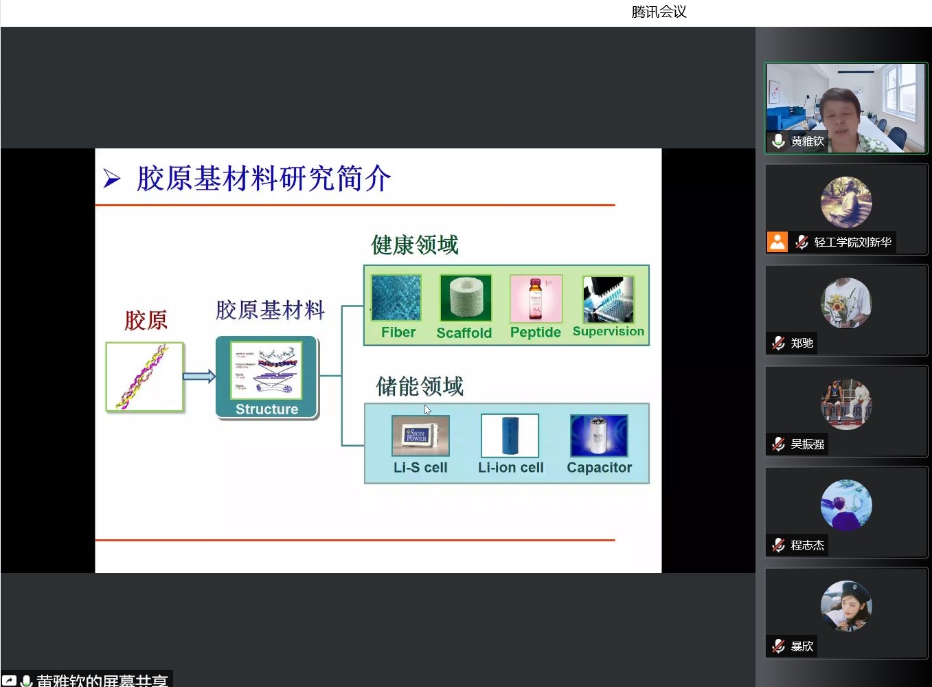 7月5日上午,應(yīng)我校輕工科學(xué)與工程學(xué)院和研究生院的邀請(qǐng),北京化工大學(xué)黃雅欽教授做客我校“未央導(dǎo)師論壇”,做了題為“膠原基材料的設(shè)計(jì)制備”的線上學(xué)術(shù)報(bào)告。報(bào)告由副校長王學(xué)川教授主持,輕工學(xué)院相關(guān)專業(yè)教師、研究生參加了此次報(bào)告會(huì)。