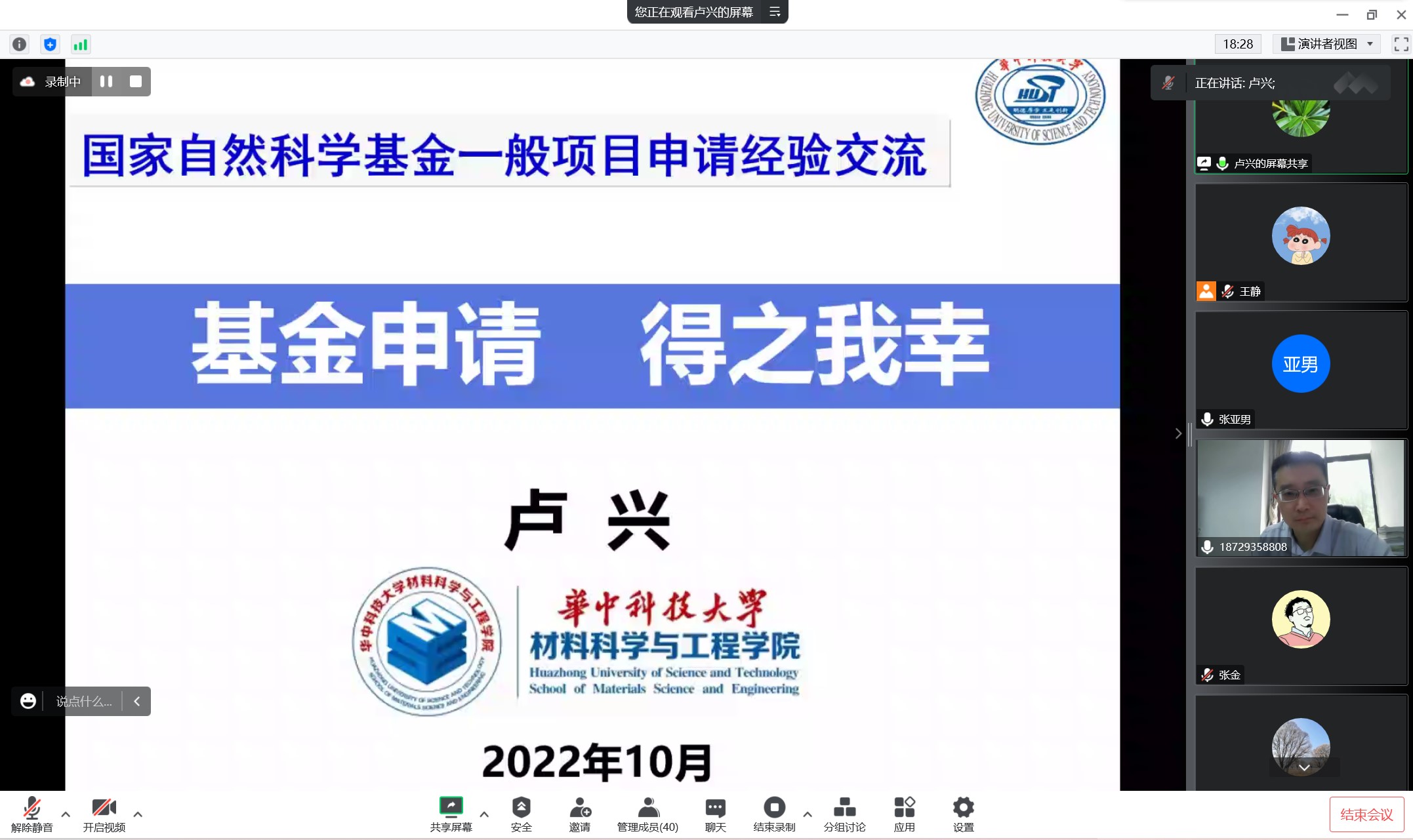 10月13日,受我??萍继?、化學與化工學院邀請,華中科技大學盧興教授做客我?!扒把乜茖W報告”,為我校師生帶來題目為“國家自然科學基金申報指導講座”的線上報告。報告由化工學院院長費貴強教授主持,相關教師參加了此次報告。