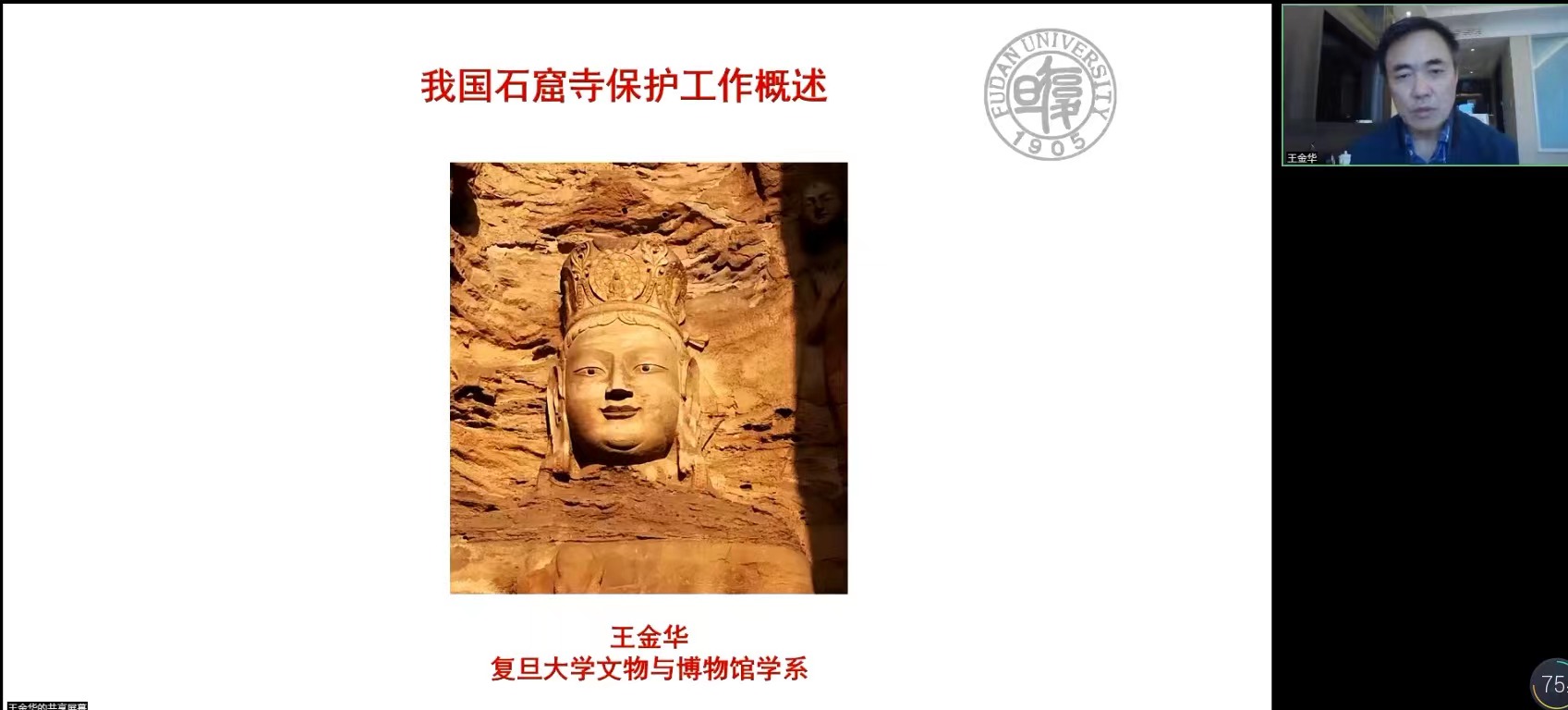 11月6日,應(yīng)我??萍继?、材料科學(xué)與工程學(xué)院(文物保護科學(xué)與技術(shù)學(xué)院)邀請,復(fù)旦大學(xué)王金華教授做客我校“前沿科學(xué)報告”,作了題為“我國石窟寺保護工作概述”的線上學(xué)術(shù)報告。報告由材料學(xué)院院長朱建鋒教授主持,學(xué)院相關(guān)領(lǐng)域教師和研究生參加了此次報告會。