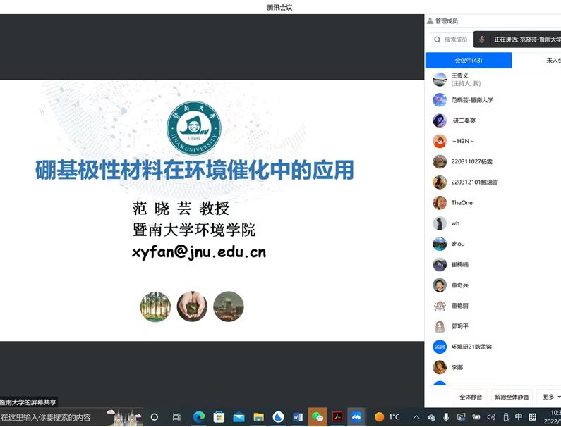 12月6日,應(yīng)我校科技處、研究生院、環(huán)境科學(xué)與工程學(xué)院邀請(qǐng),浙江海洋大學(xué)周英棠教授、暨南大學(xué)范曉蕓教授做客我?!把芯可鷮W(xué)術(shù)月”活動(dòng)暨“未央導(dǎo)師論壇”,同時(shí)基于趙進(jìn)才院士工作室、西北生態(tài)環(huán)境材料與技術(shù)創(chuàng)新引智基地以及生態(tài)環(huán)境材料與綠色低碳技術(shù)國(guó)際科技合作基地開展學(xué)術(shù)交流。兩位教授分別作了題為“相結(jié)材料在催化、檢測(cè)及腫瘤治療中的研究與探討”“硼基極性材料在環(huán)境催化中的應(yīng)用”的線上學(xué)術(shù)報(bào)告,相關(guān)教師、研究生200余人參加會(huì)議。環(huán)境學(xué)院學(xué)術(shù)院長(zhǎng)王傳義教授主持會(huì)議。
